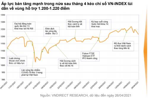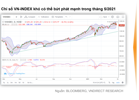 VNDIRECT dự báo chỉ số VN-Index dao động trong vùng từ 1.160 - 1.260 điểm trong tháng 5/2021. Đồng thời khuyến cáo nhà đầu tư nên chủ động hạ tỷ trọng cổ phiếu về ngưỡng an toàn để giảm thiểu rủi ro.