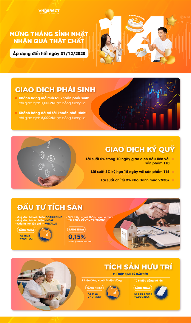 Chương trình ưu đãi mừng sinh nhật lần thứ 14 của VNDIRECT trải dài trên hàng loạt sản phẩm đầu tư, bao gồm giao dịch cơ sở, giao dịch phái sinh, trái phiếu, chứng chỉ quỹ, tích sản hưu trí … với tiêu chí “Sinh nhật VNDIRECT - Ai cũng có quà”.