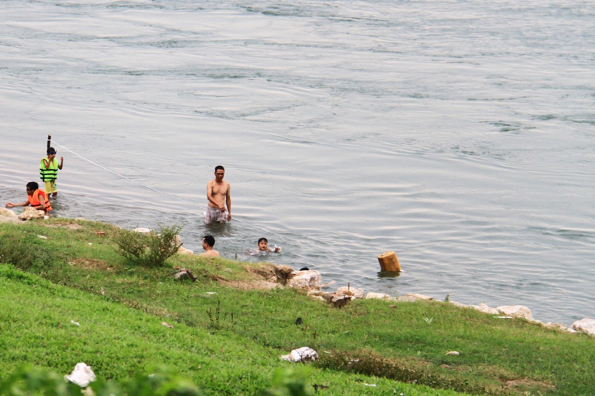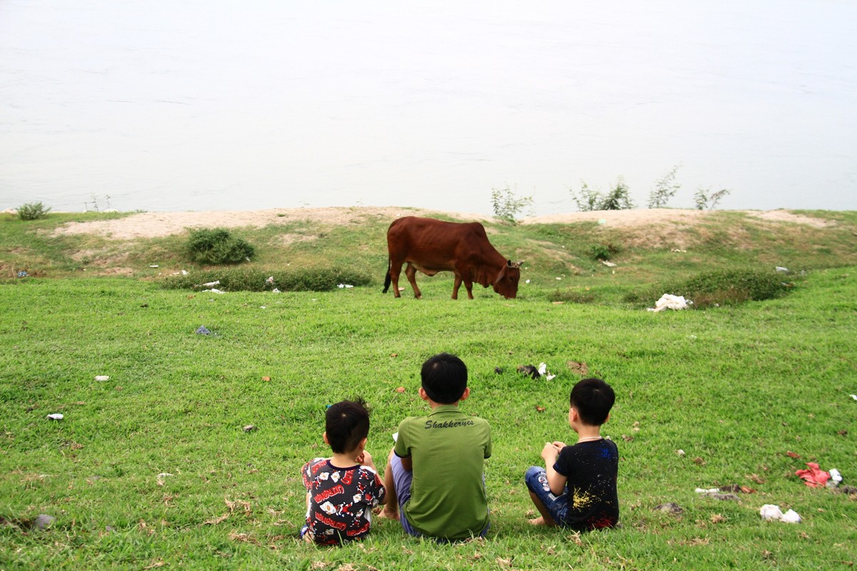 Triền đê và con sông luôn hấp dẫn đám trẻ. Ảnh: Thành Nguyễn.