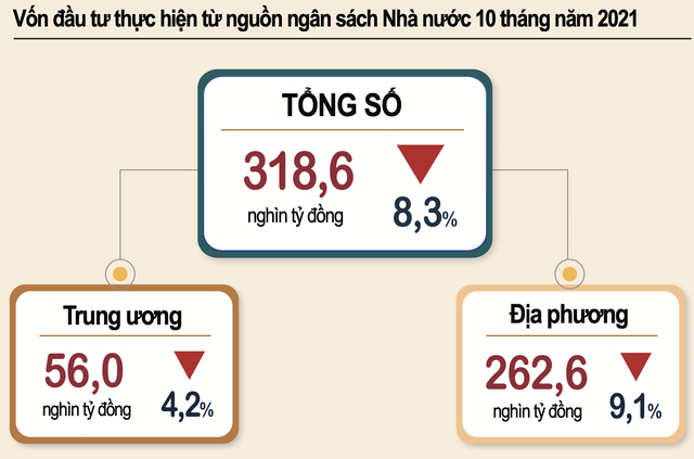Tính chung 10 tháng năm 2021, vốn đầu tư thực hiện từ nguồn ngân sách Nhà nước đạt 318,6 nghìn tỷ đồng, bằng 64,7% kế hoạch năm và giảm 8,3% so với cùng kỳ năm trước (cùng kỳ năm 2020 bằng 67,8% và tăng 31,6%).