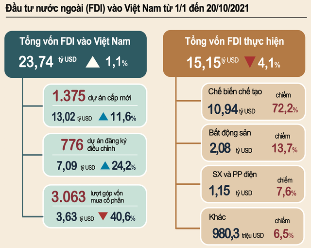 Tổng vốn đầu tư nước ngoài đăng ký vào Việt Nam (FDI) tính đến ngày 20/10/2021 bao gồm vốn đăng ký cấp mới, vốn đăng ký điều chỉnh và giá trị góp vốn, mua cổ phần của nhà đầu tư nước ngoài đạt 23,74 tỷ USD, tăng 1,1% so với cùng kỳ năm trước.