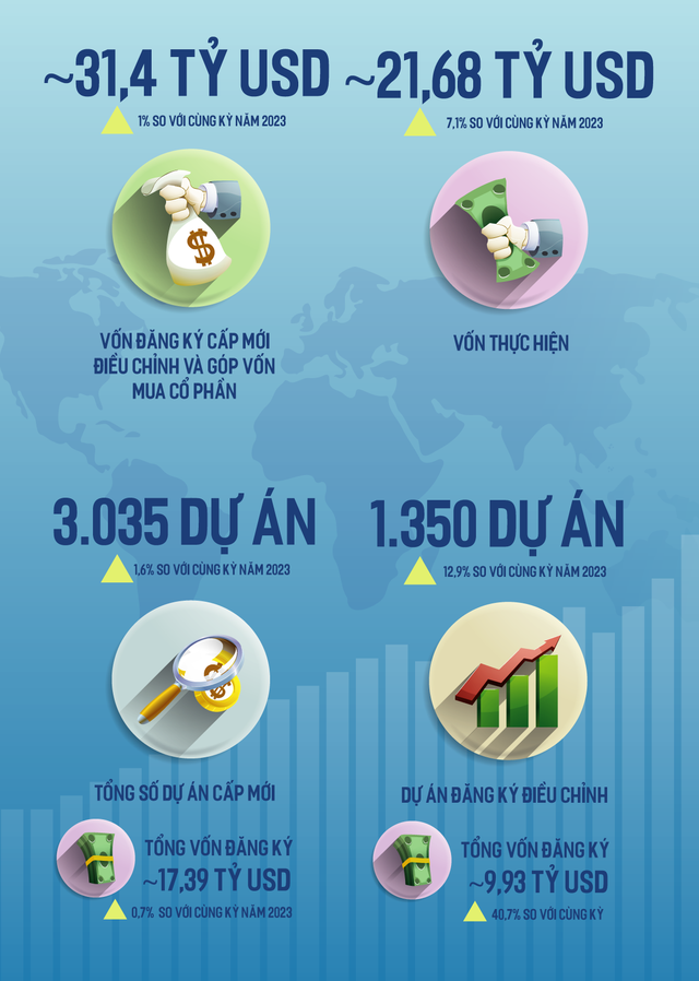 Cụ thể, theo dữ liệu từ Cục Đầu tư nước ngoài (Bộ Kế hoạch và Đầu tư), tính đến ngày 30/11/2024, tổng vốn đăng ký cấp mới, điều chỉnh và góp vốn mua cổ phần, mua phần vốn góp của nhà đầu tư nước ngoài đạt gần 31,4 tỷ USD, tăng 1% so với cùng kỳ năm 2023.