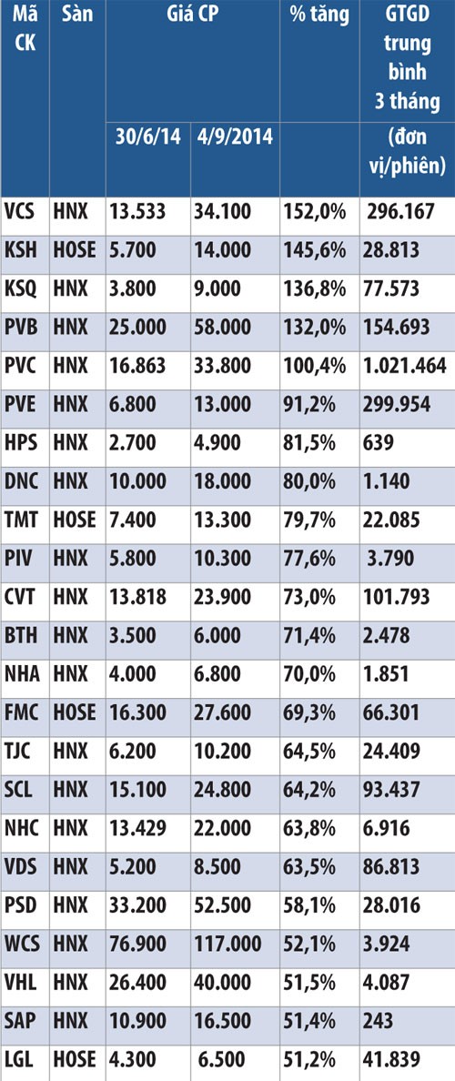 Dẫn đầu là cổ phiếu VCS của CTCP Vicostone, với mức tăng trưởng 152% từ 13.533 đồng/CP (30/6/2014) lên 34.100 đồng/CP kết thúc phiên giao dịch ngày 4/9/2014. Khối lượng giao dịch bình quân mỗi phiên đạt 296.167 cổ phiếu/phiên.