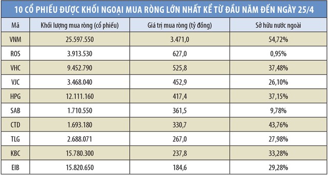 Tính chung cả hai sàn HOSE và HNX đến hết phiên 25/4, khối ngoại đã mua vào 880,9 triệu cổ phiếu, trị giá 36.867 tỷ đồng, trong khi bán ra 914,2 triệu cổ phiếu, trị giá hơn 31.273 tỷ đồng. Theo đó, khối ngoại bán ròng về khối lượng 33,2 triệu cổ phiếu, nhưng mua ròng về giá trị gần 5.600 tỷ đồng.