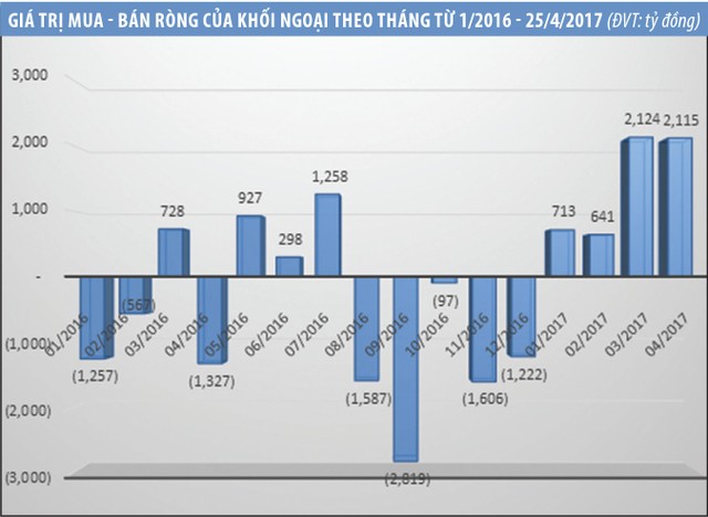 Những tưởng thông tin bất lợi từ diễn biến kinh tế - chính trị trên thế giới như ông Donald Trump chính thức nhậm chức Tổng thống Mỹ với chính sách bảo hộ nền sản xuất trong nước, tiến trình “Brexit” của Anh đang gấp rút được tiến hành, Fed nâng lãi suất cùng những dự báo về sự cải thiện của nền kinh tế Mỹ, khối ngoại sẽ tiếp tục rút vốn khỏi các thị trường mới nổi, trong đó có Việt Nam trong năm 2017. Tuy nhiên, trong 4 tháng đầu năm, giá trị mua ròng của khối nhà đầu tư nước ngoài lại tăng đột biến, trong đó tháng 3 và tháng 4/2017 ghi nhận giá trị mua ròng vượt 2.000 tỷ đồng/tháng, cao nhất kể từ năm 2014 đến nay.