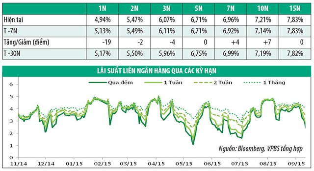 Bên cạnh đó, tỷ giá USD/VND giảm sâu trong tuần vừa qua, cũng giảm bớt áp lực lên tiền Đồng và giảm nhu cầu vay vốn ngắn hạn để đầu cơ vào tỷ giá. Nhu cầu vay vốn do vậy gần như không có. Lãi suất các kỳ hạn tham khảo ở mức: qua đêm (2,9%/năm, giảm 50 điểm), 1 tuần (3%/năm, giảm 40 điểm), 2 tuần (3,4%/năm, giảm 40 điểm) và 1 tháng (3,7%/năm, giảm 50 điểm).