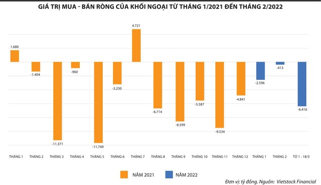 Thống kê của Vietstock Financial cho thấy, trong 4 tháng, từ tháng 11/2021 đến tháng 2/2022, giá trị bán ròng của khối ngoại giảm dần, lần lượt là 9.534 tỷ đồng, 4.841 tỷ đồng, 2.596 tỷ đồng, 412 tỷ đồng. Tuy nhiên, từ ngày 1 - 18/3/2022, khối này bán ròng lên tới 6.416 tỷ đồng.