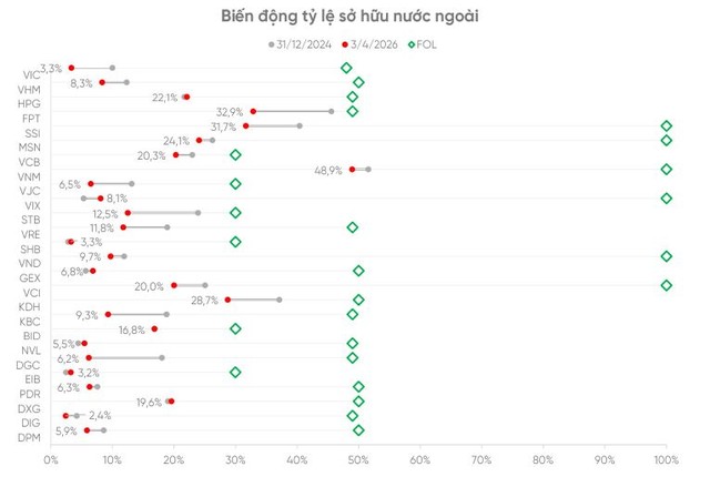 Việc khối ngoại bán ròng liên tiếp theo góc nhìn của các chuyên gia đã mở rộng dư địa sở hữu nước ngoài tại các cổ phiếu vốn hóa lớn và có thanh khoản cao. Tính đến đầu tháng 4/2026, tỷ lệ nắm giữ của nhà đầu tư nước ngoài tại phần lớn các cổ phiếu thuộc FTSE Vietnam Index đều thấp hơn đáng kể so với mức trần quy định về tỷ lệ sở nước ngoài.