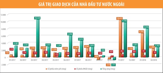 Ủy ban Giám sát tài chính quốc gia cho biết, từ đầu năm 2018, mua ròng của khối ngoại trên thị trường chứng khoán chính thức ở mức cao, đạt xấp xỉ 573 triệu USD (trong đó 542 triệu USD cổ phiếu và 31 triệu USD trái phiếu). Trong tháng 2, khối ngoại tiếp tục mua ròng 151 triệu USD trong đó mua ròng 154 triệu USD cổ phiếu và bán ròng 3 triệu USD trái phiếu.