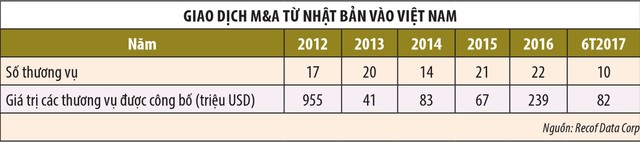 Trong đó, một số thương vụ tiêu biểu là JX Nippon Oil & Energy (JXE) thông qua công ty con JX Nippon Oil & Energy Vietnam mua 8% cổ phần Petrolimex; ANA Holdings Inc mua 8,77% vốn tại Vietnam Airlines; Taisho đầu tư vào Dược Hậu Giang; Daiwa Securities đầu tư vào Công ty Chứng khoán Sài Gòn; Mizuho Bank đầu tư vào Vietcombank…