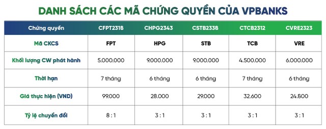 Nhằm gia tăng sự lựa chọn cho khách hàng trong hành trình đầu tư, Chứng khoán VPBank (VPBankS) chính thức ra mắt 5 mã CW mua mới với tổng số lượng phát hành hơn 33 triệu. Việc tham gia phát hành CW sẽ giúp VPBankS bổ sung thêm nhiều mảng nghiệp vụ hoạt động chính cho công ty, từ đó tạo nguồn thu đa dạng hơn, góp phần nâng cao năng lực hoạt động của công ty chứng khoán. Đồng thời, cũng giúp khách hàng có thêm một sản phẩm đầu tư nhằm giảm thiểu rủi ro và gia tăng lợi nhuận.