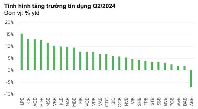 Trong 6 tháng đầu năm 2024, tăng trưởng tín dụng đạt 6,1%, tương đương 41% mục tiêu Ngân hàng Nhà nước đề ra là 15% và dự phóng của VPBankS là 14,83%. Các ngân hàng tăng trưởng tín dụng cao trong nửa đầu năm là các ngân hàng bán buôn như LPB, TCB và các ngân hàng bán lẻ có thế mạnh ở khu vực miền nam như ACB, HDB.