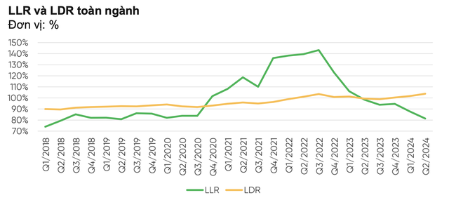 Dự phòng nợ xấu của hệ thống còn thấp khi LLR (tỷ lệ dự phòng rủi ro tín dụng) ngành chỉ đạt 81%, LDR (dư nợ tín dụng/vốn huy động) cũng đã tăng lên trên 103,8% từ cuối quý II/2024. Cùng với đó, bối cảnh thu hồi nợ xấu chưa thực sự phục hồi do thị trường bất động sản vẫn neo giá cao, chưa có nhiều dấu hiệu chuyển biến tích cực.