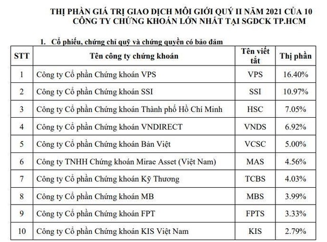 Đây là quý thứ 2 liên tiếp VPS đứng đầu bảng xếp hạng của HOSE. Trong quý 1/2021 VPS lần đầu tiên vươn lên chiếm lĩnh vị trí số 1 về thị phần môi giới cổ phiếu trên HOSE với 13,24%thị phần.