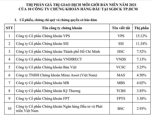 Công ty chứng khoán VPS tiếp tục duy trì vị trí dẫn đầu trong bảng xếp hạng 10 công ty có thị phần môi giới cổ phiếu lớn nhất trên sàn giao dịch chứng khoán thành phố Hồ Chí Minh (HOSE) với 16,4% thị phần, số liệu thống kế vừa được HOSE công bố cho thấy.