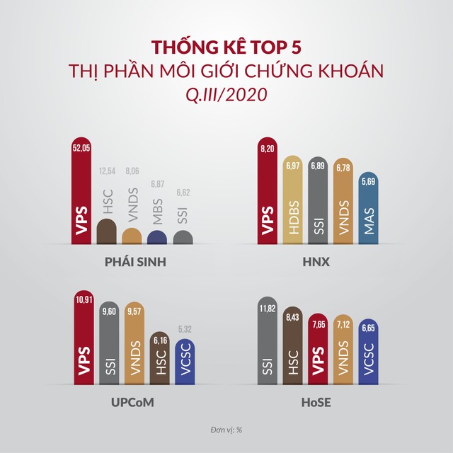 Về thị phần môi giới chứng khoán, ngoài việc duy trì một cách vững chắc vị trí số 1 ở mảng mới giới chứng khoán phái sinh với 52,05% thị phần thì trong quý 3/2020 VPS cũng đã vươn lên vị trí số 1 trên bảng xếp hạng thị phần môi giới cổ phiếu trên sàn HNX và UpCom, tương ứng với 8,2% và 10,91% thị phần.