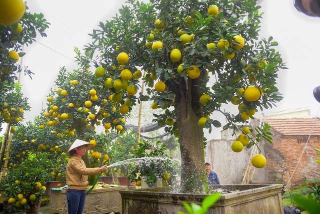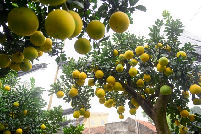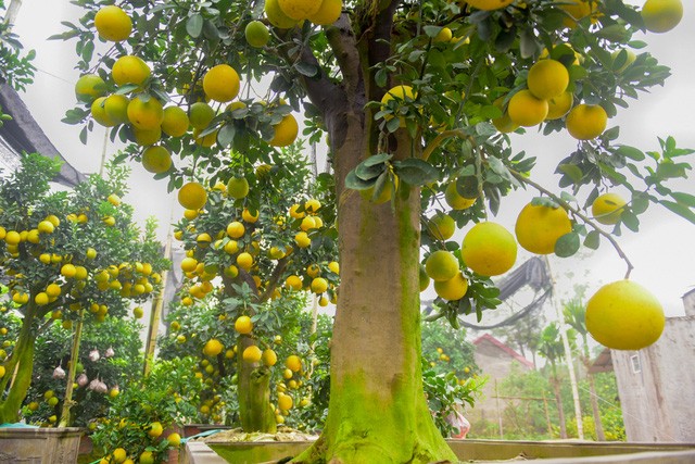Khu vườn của nhà anh Hoàng Văn Mến (Văn Giang, Hưng Yên) có khoảng 50 - 60 cây bưởi cảnh cổ thụ sai trĩu quả. Đa số những cây bưởi này có tuổi thọ lên tới hàng chục năm, cây lâu nhất khoảng 45 - 48 năm, có giá bán lên tới hơn 100 triệu đồng.