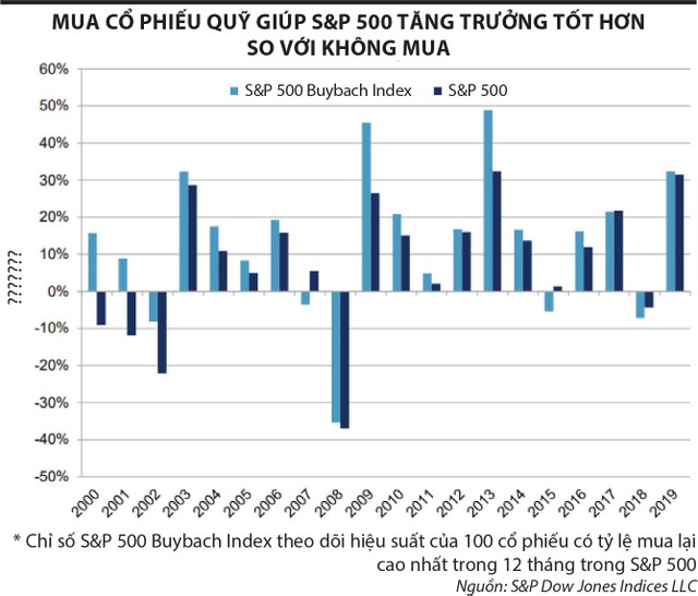 Theo một nghiên cứu của Trung tâm Cạnh tranh thị trường vốn (The Center for Capital Markets Competitiveness’s) thực hiện trên 10.000 công ty niêm yết tại Mỹ, trong thời gian 17 năm, việc mua cổ phiếu quỹ đã giúp S&P 500 tăng trưởng cao hơn so với việc không mua (xem đồ thị). Nhờ đó, lợi nhuận từ việc đầu tư cổ phiếu của nhà đầu tư cũng tốt hơn.