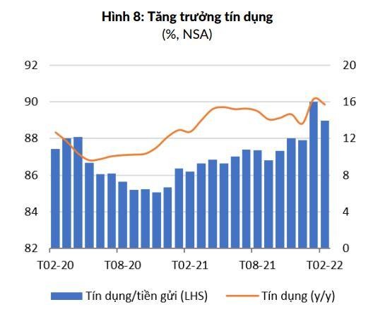 Theo Ngân hàng Thế giới, nhu cầu tín dụng vẫn cao sau Tết Nguyên đán. Dư nợ tín dụng đối với nền kinh tế tăng 15,7% so với cùng kỳ năm trước trong tháng 2, giảm nhẹ so với 16,3% (so với cùng kỳ năm trước) trong tháng 1 (Hình 8). Tuy nhiên, tốc độ tăng trưởng này cao hơn so với năm 2021, cho thấy nhu cầu tín dụng vẫn ở mức cao. Do đó, lãi suất qua đêm trên thị trường liên ngân hàng được duy trì ở mức 2,56%/năm tại thời điểm cuối tháng 2, so với mức 2,42%/năm cuối tháng 1 và tăng 1,8 điểm phần trăm so với cuối tháng 12/2021.