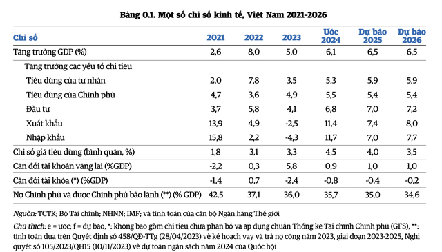 Theo WB, nền kinh tế Việt Nam được dự báo tăng trưởng 6,1% trong năm 2024, sau đó lên đến 6,5% trong các năm 2025 - 2026. Dự báo trên đã xét đến hiệu ứng xuất phát điểm cao hơn kể từ nửa cuối năm 2023 với giả định tăng trưởng xuất khẩu các mặt hàng chế tạo chế biến chững lại trong nửa cuối năm 2024, sau khi phục hồi 16,9% (so với cùng kỳ năm trước) trong nửa đầu năm 2024 và nhu cầu trên toàn cầu dự kiến chững lại năm 2024, nhất là tại Hoa Kỳ, là thị trường xuất khẩu lớn nhất của Việt Nam.