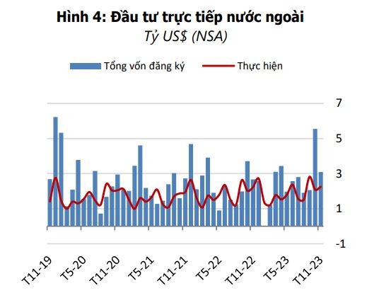 Liên quan đến cam kết FDI, theo WB, lũy kế trong 11 tháng năm 2023 tiếp tục tăng, đạt 28,8 tỷ USD, cao hơn 14,8% so với cùng kỳ năm 2022, bất chấp những bất ổn toàn cầu, phản ánh niềm tin của các nhà đầu tư vào triển vọng kinh tế Việt Nam. Tuy nhiên, con số này vẫn thấp hơn khoảng 10% so với mức trước Covid (2019). Sản xuất chiếm hơn 60% số vốn cam kết đăng ký mới và góp vốn bổ sung.
