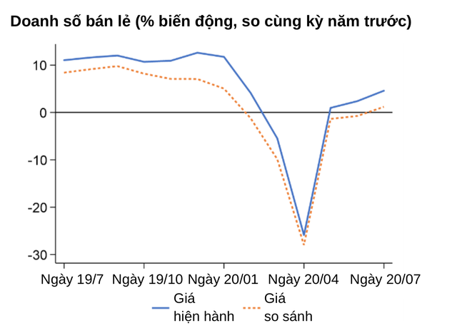 Tương tự, doanh số bán lẻ hàng hóa và dịch vụ tiếp tục phục hồi với tốc độ tăng 4,6% (so cùng kỳ năm trước). Tốc độ tăng trưởng chế tạo chế biến và doanh số bán lẻ đều thấp hơn so với tháng 7/2019. Điều đó cho thấy nền kinh tế chưa thực sự phục hồi lại ở mức như trước khi có khủng hoảng.