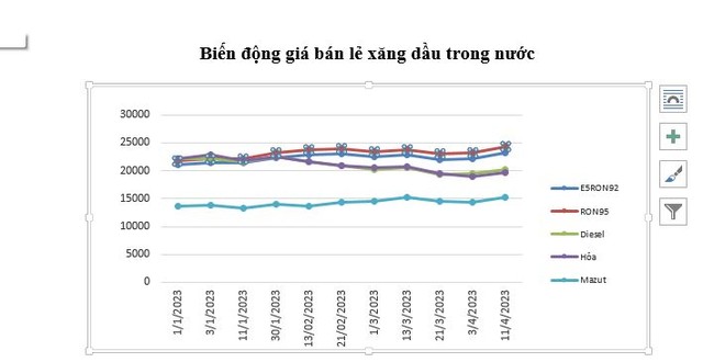 Bình quân giá thành phẩm xăng dầu thế giới giữa kỳ điều hành giá ngày 03/4/2023 và kỳ điều hành ngày 11/4/2023 là: 101,640 USD/thùng xăng RON92 dùng để pha chế xăng E5RON92 (tăng 7,818 USD/thùng, tương đương tăng 8,33% so với kỳ trước); 104,672 USD/thùng xăng RON95 (tăng 6,378 USD/thùng, tương đương tăng 6,49% so với kỳ trước); 99,356 USD/thùng dầu hỏa (tăng 4,528 USD/thùng, tương đương tăng 4,78% so với kỳ trước); 101,504 USD/thùng dầu điêzen (tăng 4,613 USD/thùng, tương đương tăng 4,76% so với kỳ trước); 464,084 USD/tấn dầu mazut 180CST 3,5S (tăng 54,156 USD/tấn, tương đương tăng 13,21% so với kỳ trước).