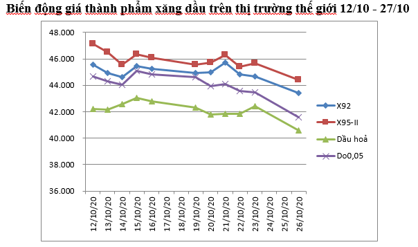 Giá thành phẩm xăng dầu thế giới trong 15 ngày trước kỳ điều hành ngày 27/10/2020, cụ thể giá bình quân các sản phẩm xăng dầu ở mức: 44,934 USD/thùng xăng RON92 dùng để pha chế xăng E5RON92 (giảm 1,44 USD/thùng, tương đương giảm 3,11% so với kỳ trước); 45,875 USD/thùng xăng RON95 (giảm 2,11 USD/thùng, tương đương giảm 4,40% so với kỳ trước).
