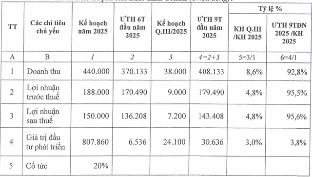 Bước sang quý III, ban lãnh đạo đặt mục tiêu doanh thu đạt 38 tỷ đồng và lãi sau thuế 7,2 tỷ đồng. Theo đó, ước tính 9 tháng 2025, Công ty có thể mang về hơn 408 tỷ đồng doanh thu và 143,4 tỷ đồng lợi nhuận sau thuế, đồng thời hoàn thành gần 93% mục tiêu doanh thu và gần 96% mục tiêu lợi nhuận cả năm.