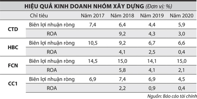 Mặc dù sở hữu khối tài sản tính tới 31/12/2020 là 9.879,8 tỷ đồng, doanh thu năm 2020 lên tới 6.838,9 tỷ đồng nhưng hiệu quả sử dụng tài sản (ROA) chỉ dao động 0,4% và tương đối thấp so với nhiều doanh nghiệp trên sàn. Đặc biệt, thấp hơn rất nhiều so với doanh nghiệp xây dựng có thương hiệu như Coteccons (CTD) với ROA năm 2020 lên tới 3%.