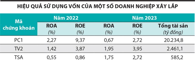 Về hiệu quả sử dụng vốn, hệ số lợi nhuận trên vốn chủ sở hữu (ROE) của Xây lắp Trường Sơn thấp hơn so với TV2 và PC1, năm 2022 là 0,86% so với 3,87% và 9,37%; năm 2023, lợi nhuận của Công ty tăng từ 3,1 tỷ đồng lên hơn 10 tỷ đồng nên ROE đạt 2,72%, bằng với PC1, nhưng thấp hơn TV2 (3,95%).
