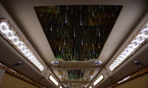 Nếu trừ vị trí ghế lái và phụ phía trước, khoang hành khách chỉ có 10 ghế rộng rãi bọc da, thiết kế như ghế máy bay hạng thương gia. Các chi tiết trang trí ốp gỗ, rèm cửa nhập khẩu từ Mỹ, thảm trải sàn, cửa kính dán phim cách nhiệt tạo ra không gian riêng cho khách sử dụng.