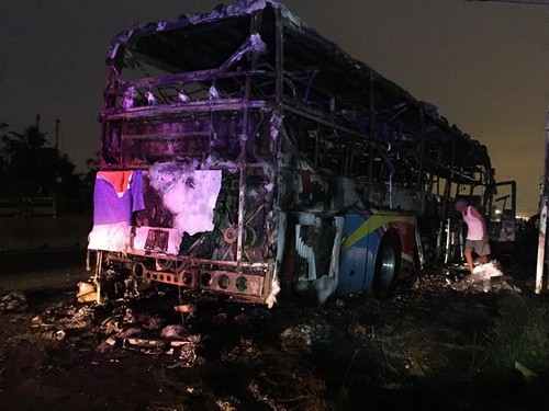 Xe kháchbị cháy rụi hoàn toàn. Ảnh:Phan Thành.