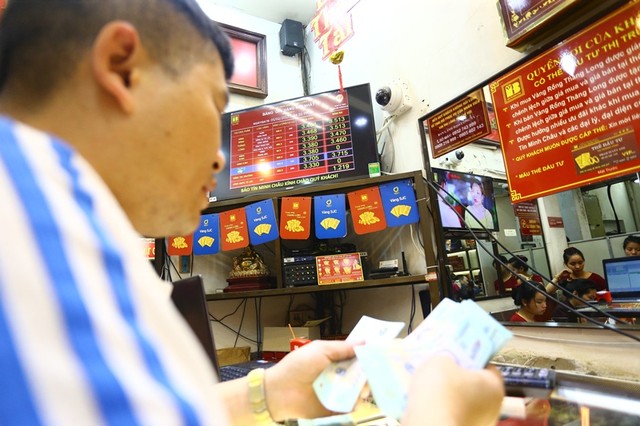 Một khách hàng sau khi thanh toán chờ nhận biên lai giấy hẹn lấy vàng