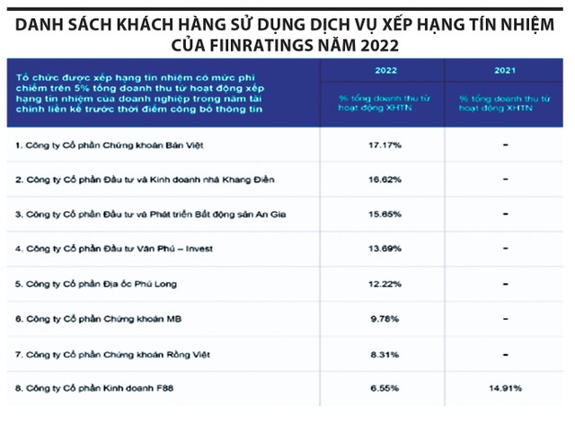 Theo thông tin công bố của FiinRatings, trong năm 2021, chỉ 4 khách hàng đã đóng góp toàn bộ doanh thu dịch vụ xếp hạng tín nhiệm của Công ty, cụ thể: Công ty Tài chính cổ phần Tín Việt (13,55%), Công ty cổ phần Kinh doanh F88 (14,91%), Công ty cổ phần Anh ngữ APAX (23,85%) và Công ty cổ phần Bamboo Capital (47,7%). Đây cũng là những doanh nghiệp tích cực hoạt động trên thị trường vốn năm 2021 với việc phát hành trái phiếu và các thương vụ nhận vốn đầu tư. Năm 2022, danh sách khách hàng của FiinRatings mở rộng lên 8 doanh nghiệp, đóng góp 100% doanh thu hoạt động xếp hạng tín nhiệm.