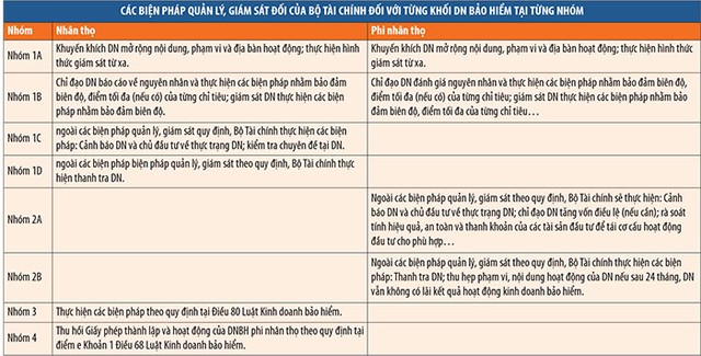Căn cứ vào kết quả phân nhóm này, Bộ Tài chính sẽ có biện pháp quản lý, giám sát riêng đối với từng khối DN bảo hiểm phi nhân thọ hay DN nhân thọ. Với DN bị xếp loại trong nhóm 4 thì dù thuộc khối nào vẫn sẽ bị Bộ Tài chính thu hồi Giấy phép thành lập và hoạt động của DN theo quy định tại điểm e Khoản 1 Điều 68 Luật Kinh doanh bảo hiểm.