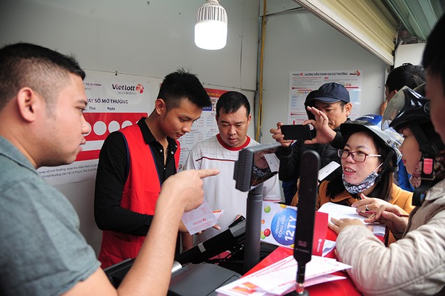 Lượng khách quá đông, nhân viên của công ty xổ số Vietlott ra tận mặt đường Trung Hòa để bán vé số cho khách hàng