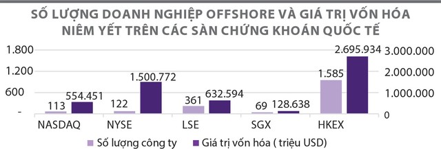 Tại sàn chứng khoán Hồng Kông (HKEX), sàn giao dịch lớn thứ 4 trên thế giới, có trên 1.500 doanh nghiệp offshore đăng ký niêm yết, đạt mức giá trị vốn hóa xấp xỉ gần 2.700 tỷ USD. Thị trường Singapore cũng ghi nhận niêm yết từ hơn 70 doanh nghiệp với tổng giá trị vốn hóa khoảng 129 tỷ USD.