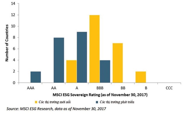 Theo xếp hạng tín nhiệm ESG quốc gia của MSCI, với 198 quốc gia và vùng lãnh thổ được đánh giá về 27 yếu tố ESG, trong số 24 thị trường được xếp hạng thị trường mới nổi, chỉ có 16% có xếp hạng ESG trên mức BBB, so với con số 83% đối với các thị trường phát triển.