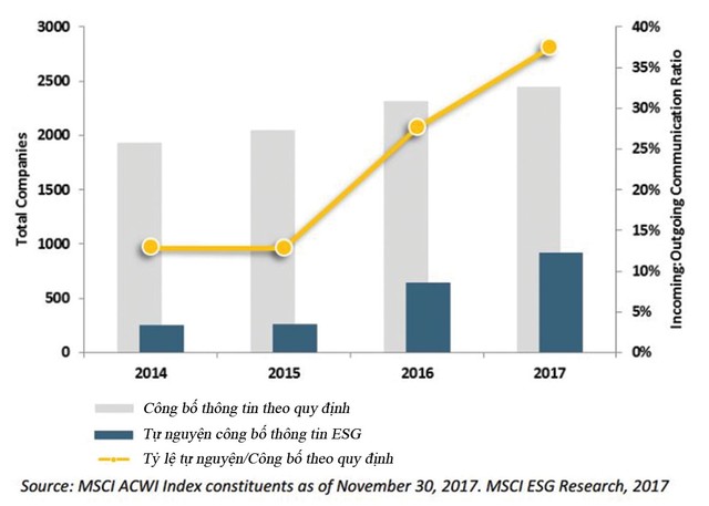 Cụ thể, MSCI chứng kiến sự tăng trưởng vượt bậc của số lượng các doanh nghiệp tự giác công bố báo cáo phát triển bền vững. Trong giai đoạn 1/1/2014 - 30/11/2017, tỷ lệ doanh nghiệp tự công bố thông tin ESG/doanh nghiệp công bố thông tin vì được yêu cầu đã tăng gần 3 lần.