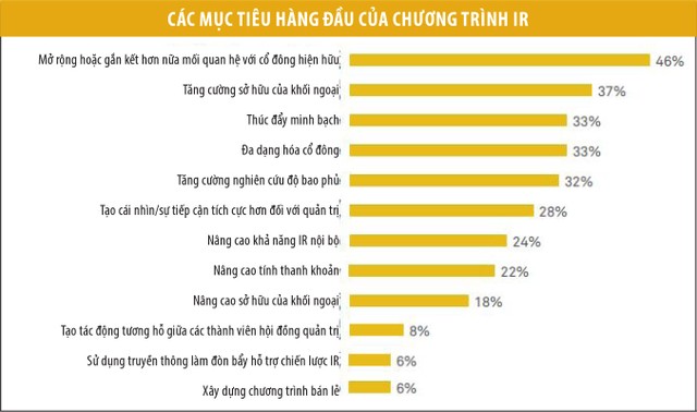 Mục tiêu hàng đầu đối với hoạt động IR của các công ty trên toàn cầu tiếp tục là mở rộng hoặc nâng cao hơn nữa sự gắn kết với các cổ đông hiện hữu, dù tỷ lệ các công ty lựa chọn ưu tiên này có giảm đi so với báo cáo trước đó. Đáng chú ý, dù 3 trong 4 mục tiêu hàng đầu có liên quan tới các cổ đông, con số các công ty nhấn mạnh tới việc tạo sự gắn kết với cổ đông đều giảm tại cả 4 mục tiêu này.
