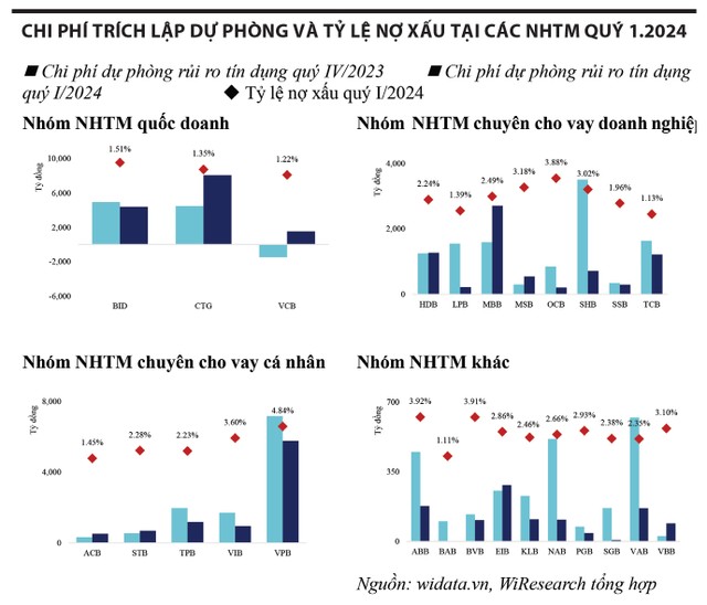 Một điểm cần lưu ý trong báo cáo tài chính quý I/2024 của các ngân hàng là phần lớn ngân hàng giảm trích lập dự phòng rủi ro tín dụng so với quý trước và có sự phân hóa lớn. Chính sách trích lập dự phòng thể hiện sự thận trọng rõ nhất ở nhóm các ngân hàng quốc doanh. Trong đó, nhóm quốc doanh đã gia tăng 76% chi phí trích lập dự phòng chỉ sau một quý dù tỷ lệ nợ xấu tăng trưởng thấp hơn.