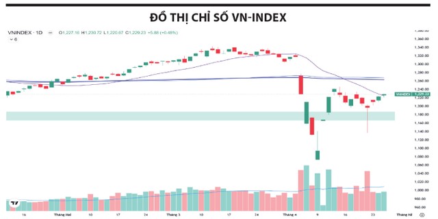 Thị trường đang trong giai đoạn thăm dò cung - cầu sau nhịp hồi phục mạnh từ vùng đáy quanh 1.140 điểm của chỉ số VN-Index. Việc lực bán hạ nhiệt tại vùng 1.200 điểm, kết hợp với tín hiệu cải thiện từ dòng tiền khối ngoại, cho thấy xu hướng hồi phục vẫn còn dư địa, với mục tiêu gần là vùng 1.250 điểm, tiệm cận đường SMA200. Dù kỳ nghỉ lễ dài sắp tới có thể khiến thanh khoản suy giảm và đà tăng chậm lại, xu hướng chung vẫn nghiêng về tích cực. Nhà đầu tư có thể tận dụng các nhịp điều chỉnh kỹ thuật để giải ngân chọn lọc, ưu tiên nhóm cổ phiếu có nền tảng cơ bản tốt và ít chịu ảnh hưởng từ các rủi ro vĩ mô và chính sách thuế quan.