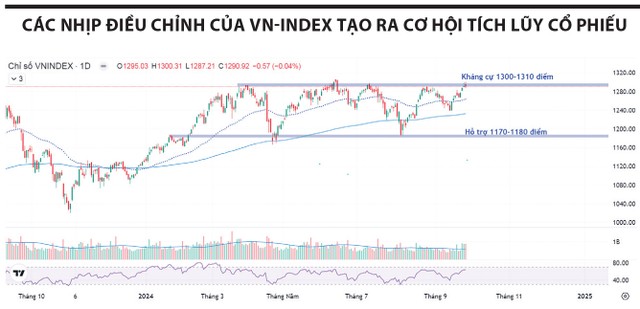 Với việc VN-Index đang giằng co tại ngưỡng kháng cự lịch sử 1.300 điểm, không loại trừ khả năng chỉ số sẽ có nhịp điều chỉnh để thu hút thêm dòng tiền chờ sẵn tại vùng 1.270 - 1.280 điểm. Các nhịp điều chỉnh nếu xảy ra sẽ là cơ hội cho nhà đầu tư gia tăng tỷ trọng cổ phiếu để đón kết quả kinh doanh quý III sắp tới.