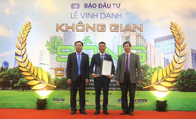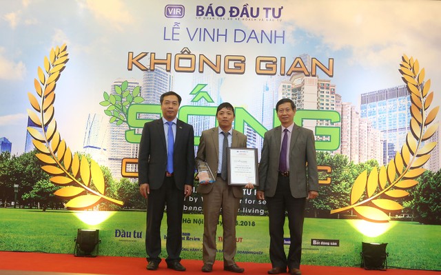 Ông Lê Trọng Minh, Tổng Biên tập Báo Đầu tư (ngoài cùng bên trái), ông Đỗ Viết Chiến, Tổng Thư ký Hiệp hội Bất động sản Việt Nam (ngoài cùng bên phải) trao cup và bằng chứng nhận cho ông Doãn Anh Tuấn, Giám đốc dự án tại Hà Nội Tập đoàn CapitaLand Việt Nam với Dự án Vistra Verde được vinh danh.