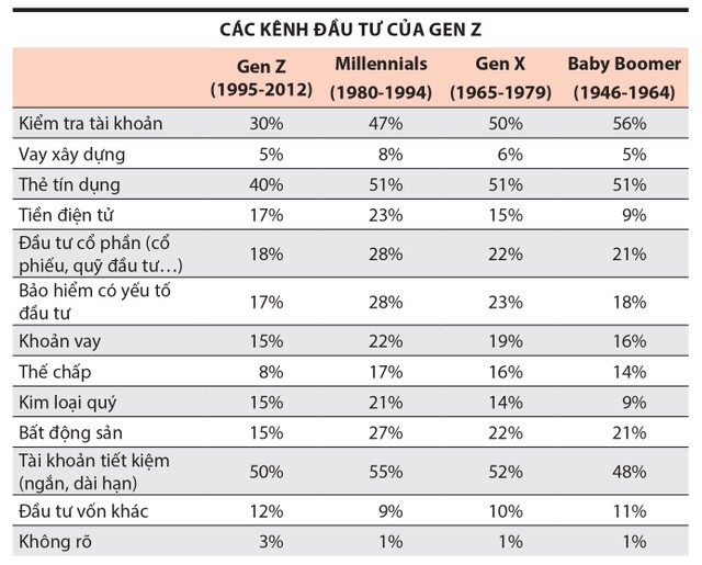 Hiện Gen Z dành đến 32% thu nhập cho tiết kiệm và tìm kiếm các cơ hội đầu tư để xây dựng tài sản bền vững. Họ không chỉ chú trọng vào việc kiếm tiền, mà còn nghiên cứu các phương pháp đầu tư và quản lý tài chính thông minh. Họ đang tích cực tham gia vào thị trường đầu tư thông qua các công cụ tài chính hiện đại như ứng dụng quản lý quỹ, ví điện tử và nền tảng giao dịch trực tuyến. Các kênh đầu tư phổ biến hiện nay bao gồm gửi tiết kiệm, mua cổ phiếu, chứng chỉ quỹ, blockchain và crypto, bất động sản. Gen Z cũng tận dụng các chương trình chiết khấu, hoàn tiền từ thanh toán trực tuyến để tối ưu hóa chi tiêu và tích lũy tài sản.