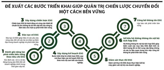Một là, đánh giá năng lực phát triển bền vững theo tiêu chí ESG. Việc này có thể được thực hiện bởi một ban chỉ đạo phát triển bền vững của doanh nghiệp, bao gồm thành viên hội đồng quản trị phụ trách ESG (hoặc uỷ ban ESG thuộc hội đồng quản trị nếu có điều kiện thành lập), tổng giám đốc và giám đốc của các bộ phận chức năng có liên quan. Công tác đánh giá có thể tự thực hiện hoặc được hỗ trợ bởi các tổ chức chuyên môn, giúp xác định các rủi ro và tác động trọng yếu ESG đối với doanh nghiệp, định hình các bước đi chiến lược cho doanh nghiệp, cũng như giúp tập thể lãnh đạo doanh nghiệp có tầm nhìn chung trong việc đối phó với các thách thức bền vững sắp tới.