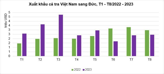 Xuất khẩu cá tra sang Đức bắt đầu ghi nhận giảm từ tháng 6/2023. Tháng 7 và tháng 8/2023, xuất khẩu cá tra sang Đức cũng giảm lần lượt 28% và 18% so với cùng kỳ năm ngoái.
