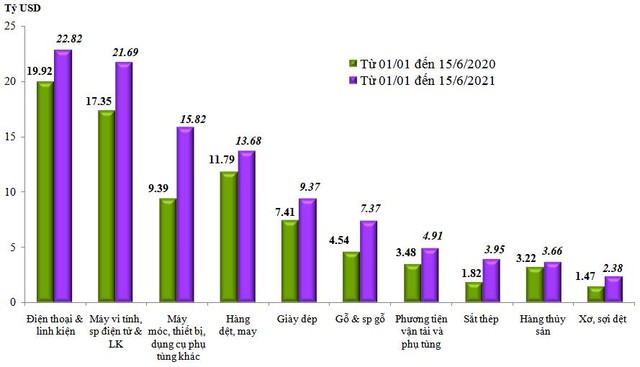 Tính đến 15/6/2021, nhiều mặt hàng xuất khẩu có giá trị tăng thêm hàng tỷ USD, như máy móc thiết bị là 6,43 tỷ USD, điện thoại 2,9 tỷ USD...