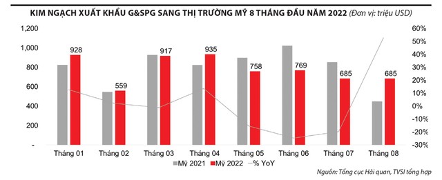 Sang năm 2022, theo số liệu của Tổng cục Hải quan, giá trị xuất khẩu G&SPG của Việt Nam sang thị trường Mỹ tính đến hết tháng 8 là hơn 6,2 tỷ USD, giảm 2% so với cùng kỳ năm 2021 và chiếm 56% tổng kim ngạch xuất khẩu toàn ngành gỗ.